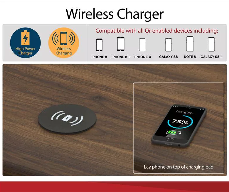 - Wireless charging spot on the desktop is compatible with all Qi-enabled devices and allows you to charge without the hassle of cords