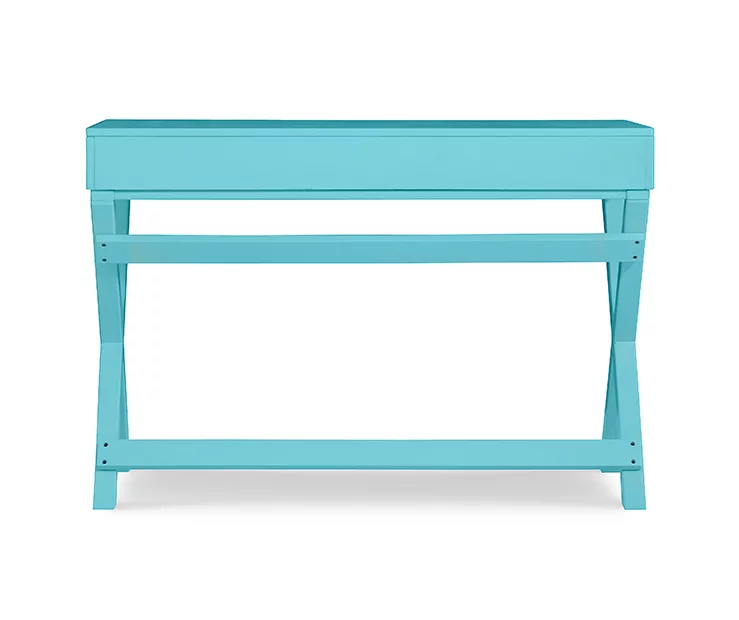 Refresh your home with this chic writing desk featuring sleek lines of an X-base accented by gleaming silver hardware. The vibrant blue finish makes a statement in any space with a fun, youthful look. A large work area offers ample space for a computer, books and a lamp. Two drawers offer storage space for smaller items.