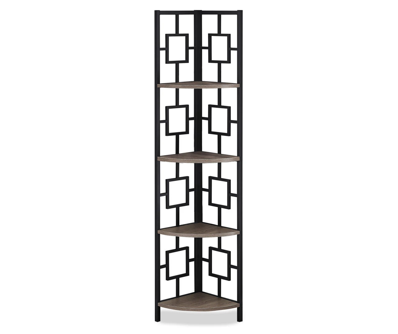 Perfect for photo frames, plants, other decorative items and even kitchen accessories, this transitional-style corner bookcase will upgrade your décor. Including four dark taupe display shelves, this corner display unit features a three-leg black metal frame and a square design that will add modern flair wherever you choose to place it.
