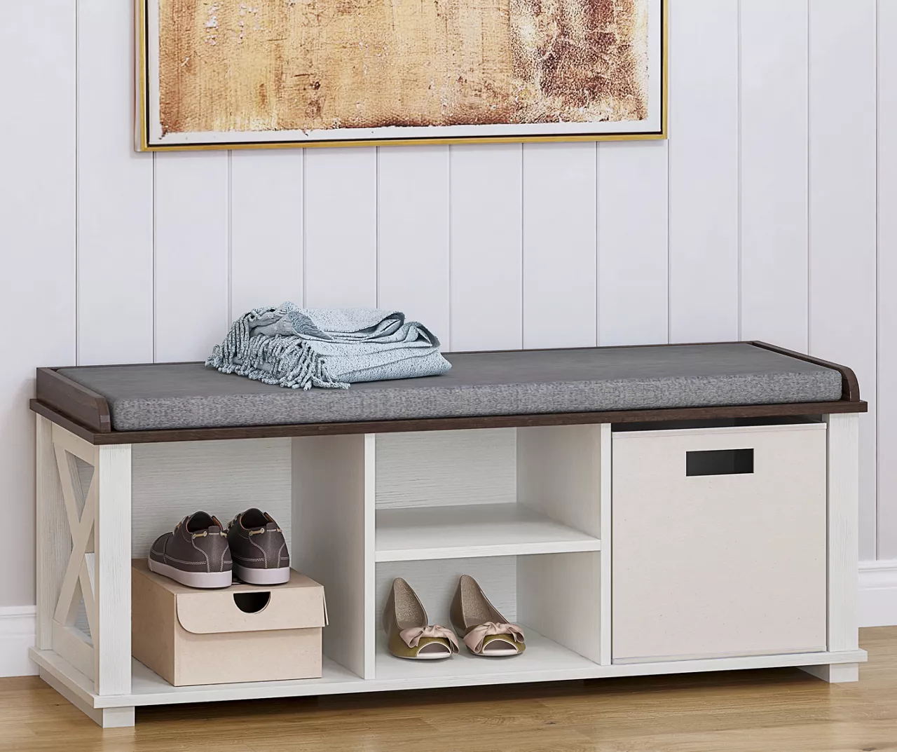 Bring convenience and storage to an entryway, foyer or mudroom with the Stratford bench. It features a farmhouse-meets-modern design with a two-tone white base and a dark brown finish top. Lower cubbies and shelving offer a place to store shoes and accessories as you sit on the cushioned gray seat on your way out the door.