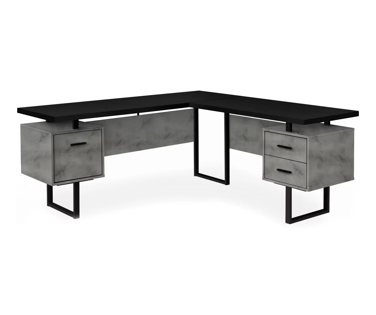 Give your home office a promotion with this extra-large, corner computer desk with three storage drawers. Finished in a gray concrete-look laminate that contrasts the black desktop, this thick-panel, L-shaped floating desktop provides plenty of room for you to spread out everything you need to be productive. And, with two small drawers and one large drawer with a bar for hanging files, you’ll have tons of space for the items you want to keep off your work surface.