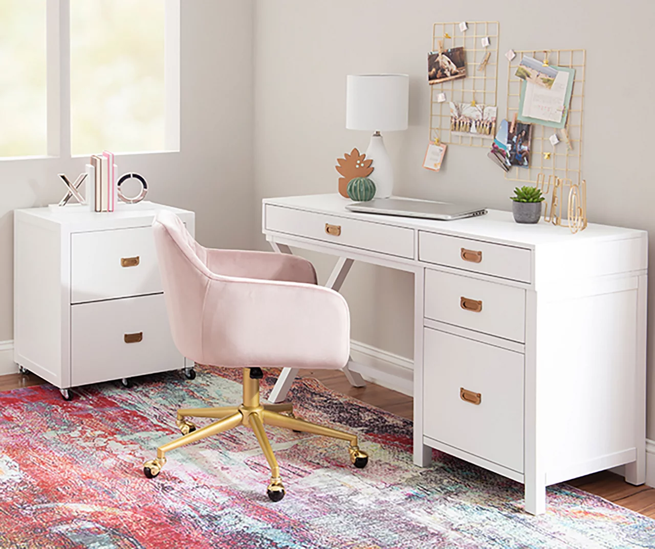Gain new levels of control over your productivity and organization with this sleek desk and storage combination. The design provides an ample workspace without overcrowding your home office or bedroom. Three drawers and a larger storage drawer are seamlessly tucked under the desk and equipped with shiny gold metal handles. The modern white finish pairs well with today’s cutting edge decor, but is subtle enough to blend with almost any other setting.