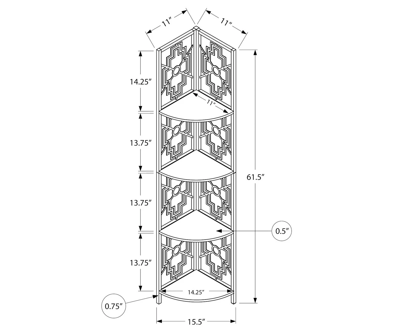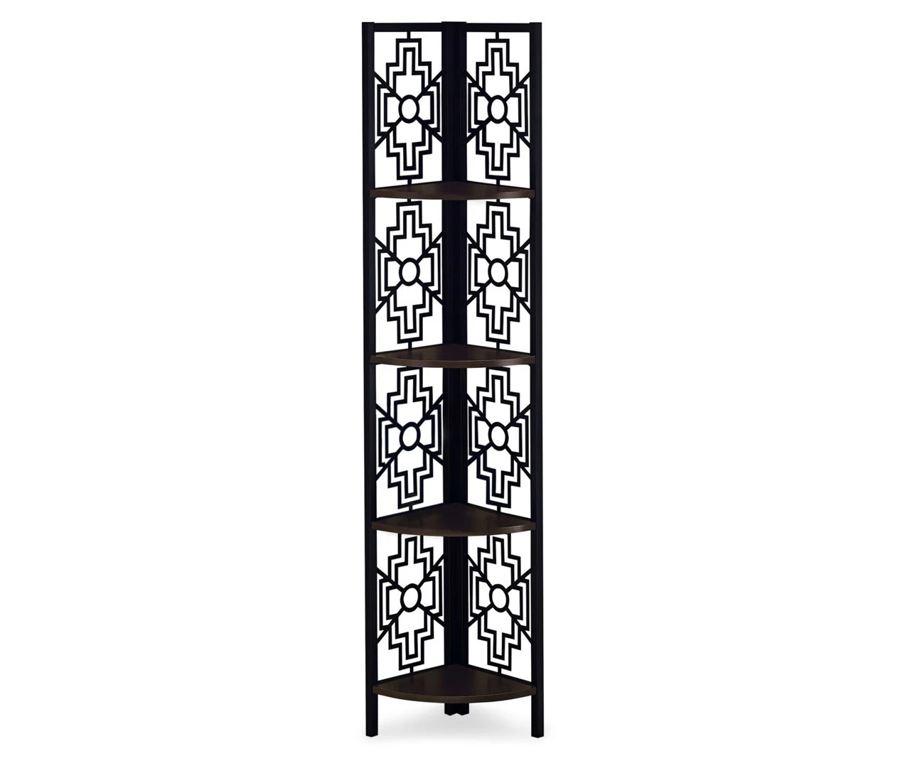 Let this stylish corner bookcase conquer the clutter in your home, apartment or condo. The black metal frame features a transitional design with four matching display shelves perfect for photo frames, plants, accessories and other decorative items. This storage accent piece will add a touch of elegance to any room in your home.