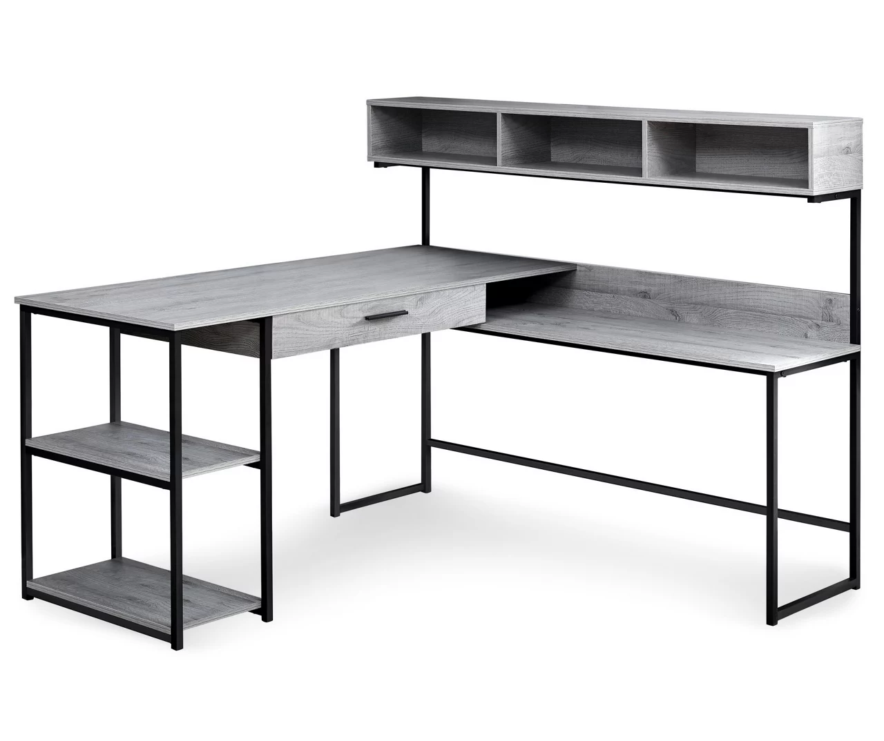 Let this L-shaped corner desk inspire you with its practical and modern industrial aesthetic. It starts with a smooth laminate finish on all sides in a chic gray woodgrain finish accented with strong black metal framing. The numerous storage options include a wide drawer on metal glides with a sturdy black handle alongside an open cubby and two fixed bottom shelves for books, magazines or even a small printer. The side station is so useful with three spacious cubbies on top for all your work essentials.
