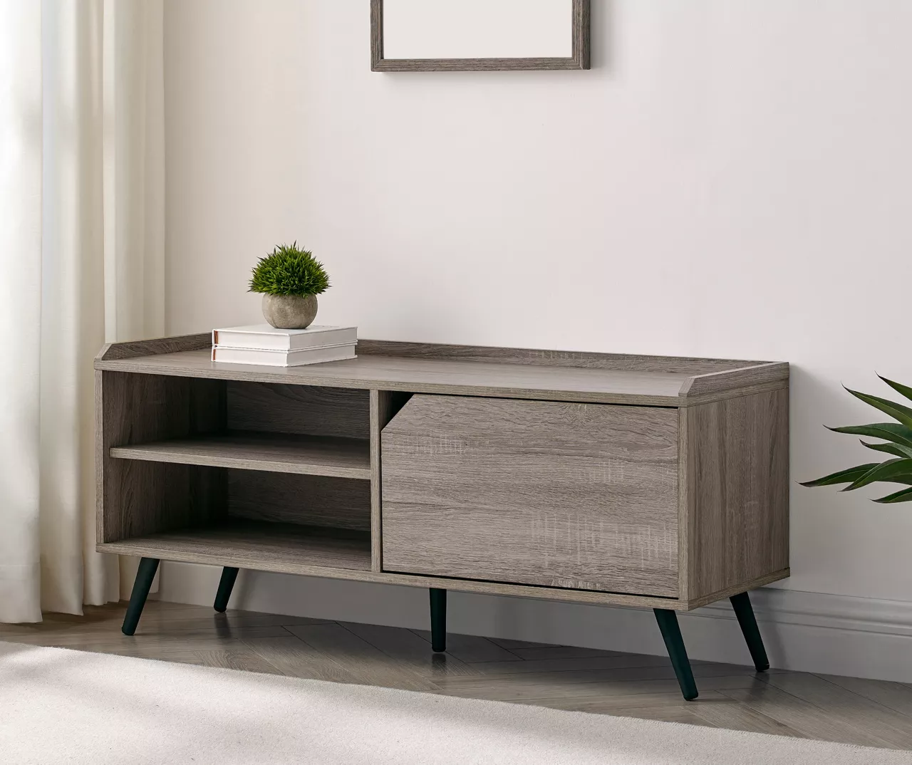 Situate your busy hallway hub with a bench that beckons you to stay a while. This modern entryway seat offers a place to rest or put on your shoes before you head out the door, as well as a discreet storage spot. Two adjustable shelves serve as a functional pit-stop to lace up cleats and grab lunch bags for the busy family or to simply showcase and easily access your shoes and handbags. With its contemporary notched door and minimal yet sturdy build, this is a piece you’ll want to feature in your foyer for each hello and every farewell.